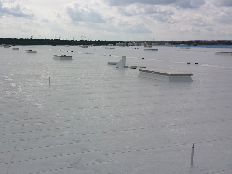 | | Deutschland, Ettlingen, Tiefkühllager, Dachabdichtung mit TPO-Dachbahnen |