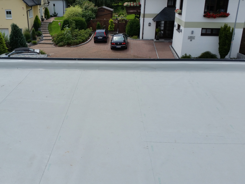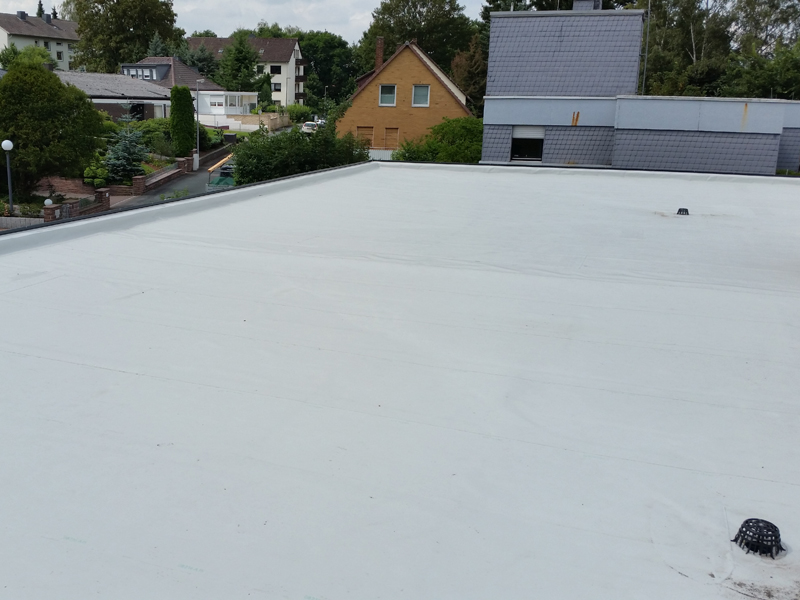 | | Deutschland, Bückeburg, Mehrfamilienhaus, Dachabdichtung mit selbstklebender TPO-Dachbahn |