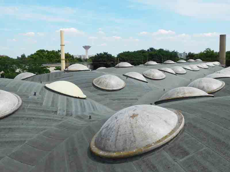 | | Deutschland, Berlin-Teltow, Mömax Möbelhaus, Dachabdichtung mit KÖSTER TPO-Dachbahnen, mechanisch befestigt |