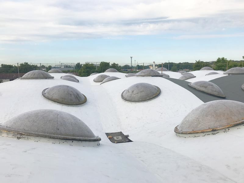 | | Deutschland, Ettlingen, Tiefkühllager, Dachabdichtung mit TPO-Dachbahnen |