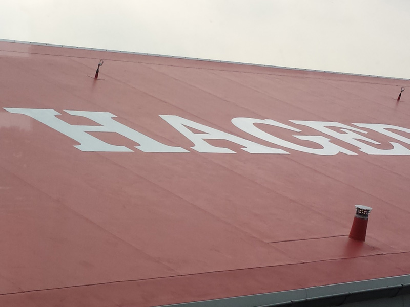 | | Deutschland, Berlin-Teltow, Mömax Möbelhaus, Dachabdichtung mit KÖSTER TPO-Dachbahnen, mechanisch befestigt |