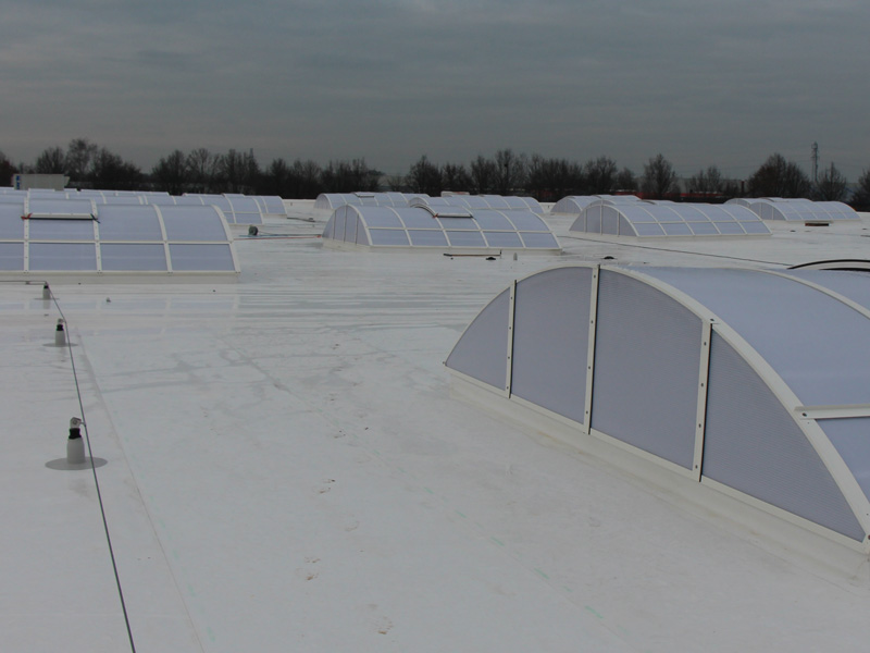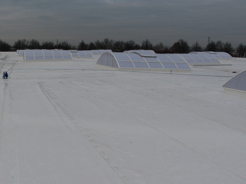| | Deutschland, Ettlingen, Tiefkühllager, Dachabdichtung mit TPO-Dachbahnen |