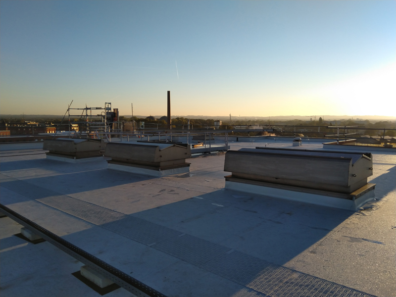 | | Deutschland, Braunschweig, Flachdachsanierung der Abdichtungsebene |