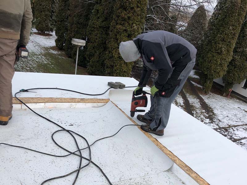 | | Deutschland, Bückeburg, Mehrfamilienhaus, Dachabdichtung mit selbstklebender TPO-Dachbahn |