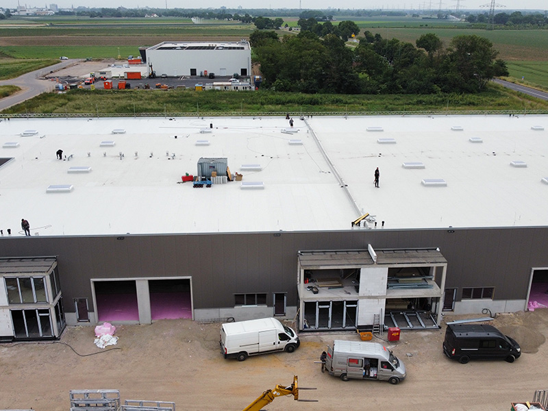 | | Deutschland, Ettlingen, Tiefkühllager, Dachabdichtung mit TPO-Dachbahnen |